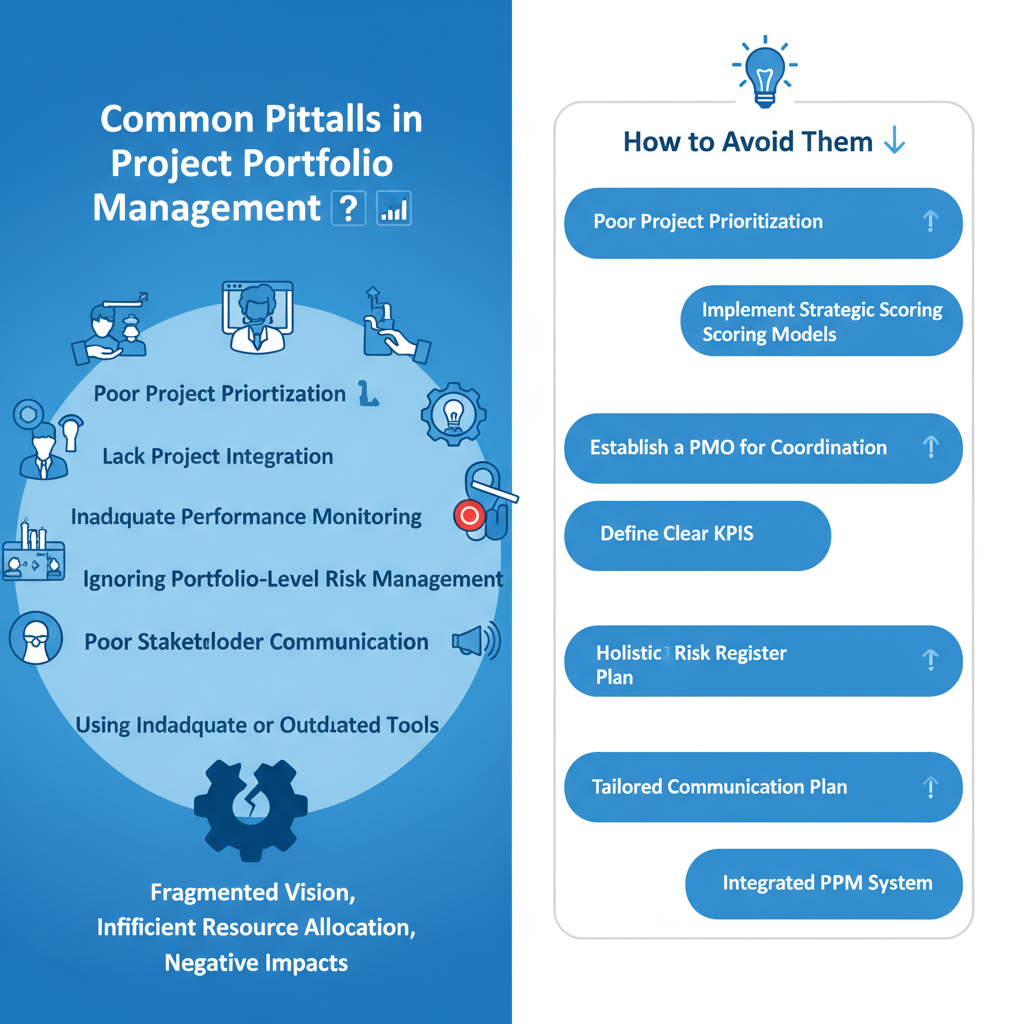 Common Pitfalls in Project Portfolio Management include poor project prioritization, lack of integration between projects, inadequate performance monitoring, neglecting portfolio-level risk management, poor stakeholder communication, and using outdated or inappropriate tools. These mistakes can result in a fragmented vision, inefficient resource allocation, and overall negative impacts on project performance. 🚧