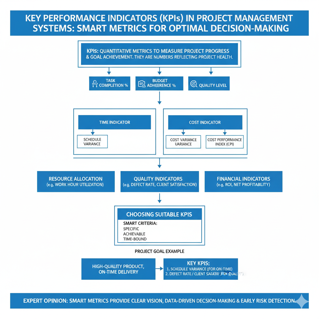 مؤشرات الأداء الرئيسية (KPIs) هي مقاييس كمية (Metrics) تساعد في قياس مدى تقدم المشروع وتحقيقه لأهدافه، باختصار هي أرقام تُعبِّر عن صحة المشروع، مثل النسبة المئوية لإنجاز المهام، أو نسبة الالتزام بالميزانية أو مستوى الجودة.