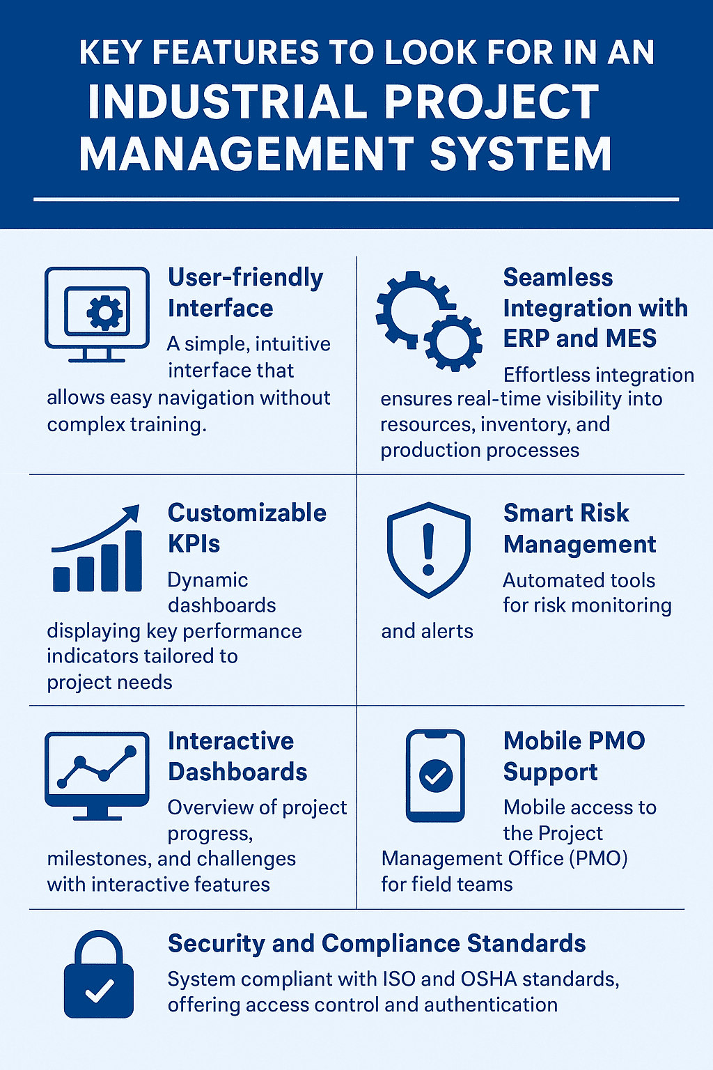 When selecting an Industrial Project Management System, it’s crucial to ensure that the platform includes the following features to optimize project efficiency, minimize risks, and enhance decision-making: