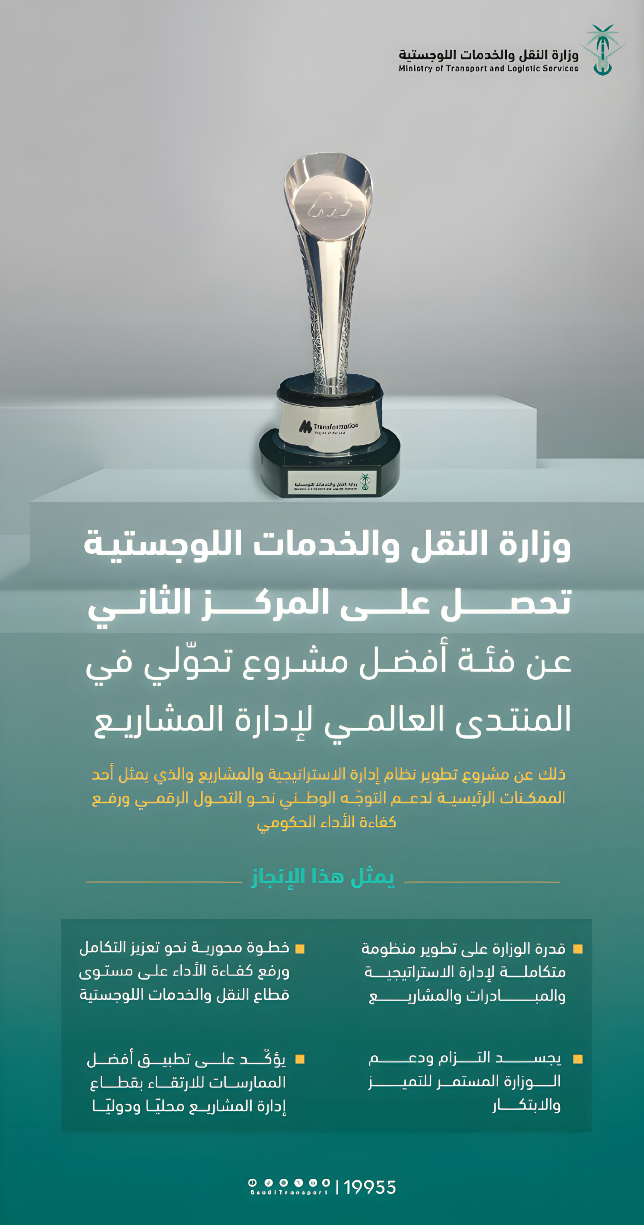 Warm congratulations to our partners at the Ministry of Transport and Logistics on winning second place in the “Best Transformational Project” category at the Global Project Management Forum, for the Strategic and Project Management System project. This project supports the monitoring and implementation of national transport and logistics strategic initiatives, as well as institutional projects.